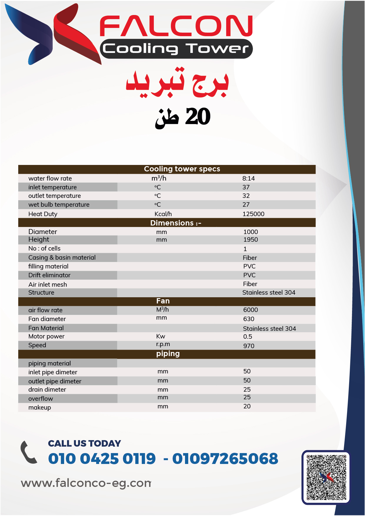 باختيار برج التبريد 20 طن من “فالكون”، لا تقتصر فقط على شراء منتج، بل تستثمر في حل طويل الأمد يجمع بين المتانة، الكفاءة، والمسؤولية البيئية. إنه خيار يستجيب لمتطلبات العصر الذي نعيشه، حيث أصبحت معايير التوفير في الطاقة والمياه ركيزة أساسية في أي مشروع. مع “فالكون”، أنت تضع ثقتك في تقنية متقدمة وخدمة ما بعد البيع موثوقة، تضمن لك تشغيلاً سلسًا وهادئًا لسنوات قادمة.